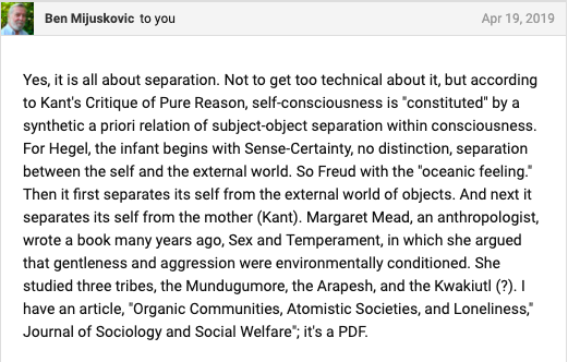 Jason - Ben Mijuskovicto youApr 19, 2019Yes, it is all about separation. Not to get too technical about it, but according to Kant’s Critique of Pure Reason, self-consciousness is “constituted” by a synthetic a priori relation of subject-object separation within consciousness. For Hegel, the infant begins with Sense-Certainty, no distinction, separation between the self and the external world. So Freud with the “oceanic feeling.” Then it first separates its self from the external world of objects. And next it separates its self from the mother (Kant). Margaret Mead, an anthropologist, wrote a book many years ago, Sex and Temperament, in which she argued that gentleness and aggression were environmentally conditioned. She studied three tribes, the Mundugumore, the Arapesh, and the Kwakiutl (?). I have an article, “Organic Communities, Atomistic Societies, and Loneliness,” Journal of Sociology and Social Welfare”; it’s a PDF.