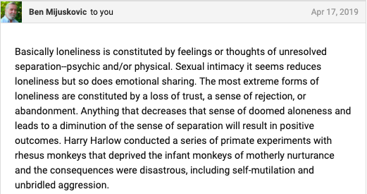 Jason Hall - Ben Mijuskovicto youApr 17, 2019Basically loneliness is constituted by feelings or thoughts of unresolved separation–psychic and/or physical. Sexual intimacy it seems reduces loneliness but so does emotional sharing. The most extreme forms of loneliness are constituted by a loss of trust, a sense of rejection, or abandonment. Anything that decreases that sense of doomed aloneness and leads to a diminution of the sense of separation will result in positive outcomes. Harry Harlow conducted a series of primate experiments with rhesus monkeys that deprived the infant monkeys of motherly nurturance and the consequences were disastrous, including self-mutilation and unbridled aggression.