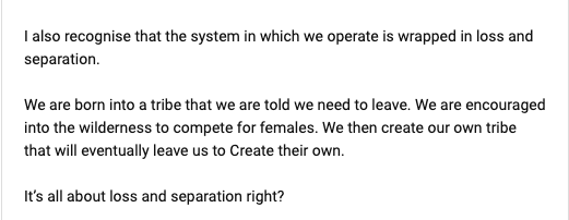 We are born into a tribe that we are told we need to leave. We are encouraged into the wilderness to compete for females. We then create our own tribe that will eventually leave us to Create their own.